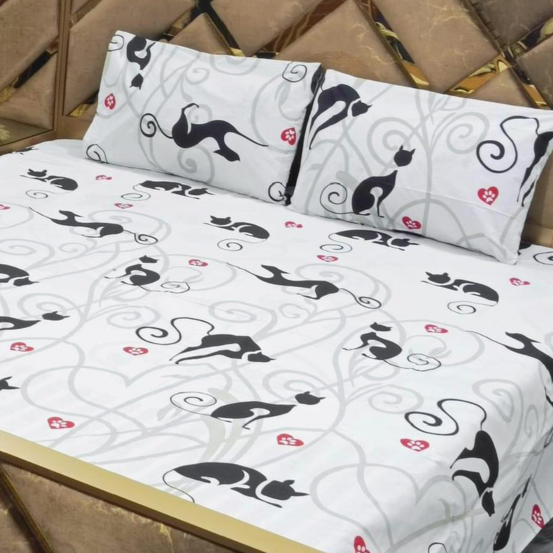 Soft Cotton 3 Pcs King Size Bed Sheet Black Cat Design with Pillow Covers